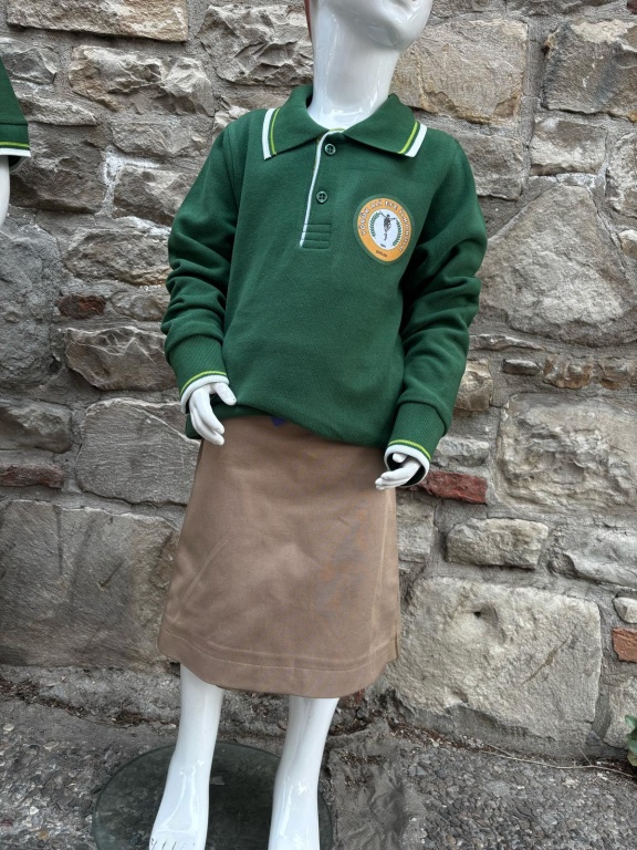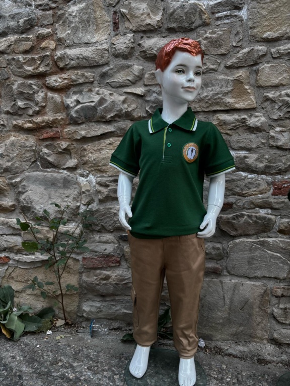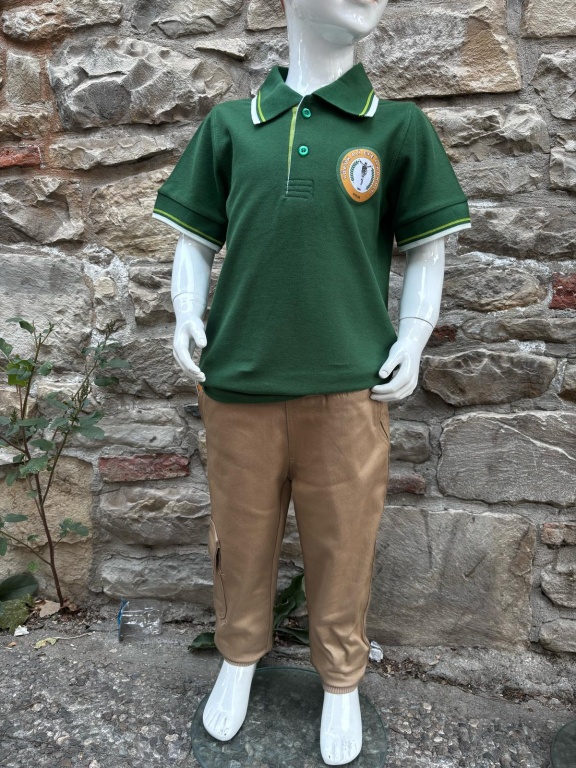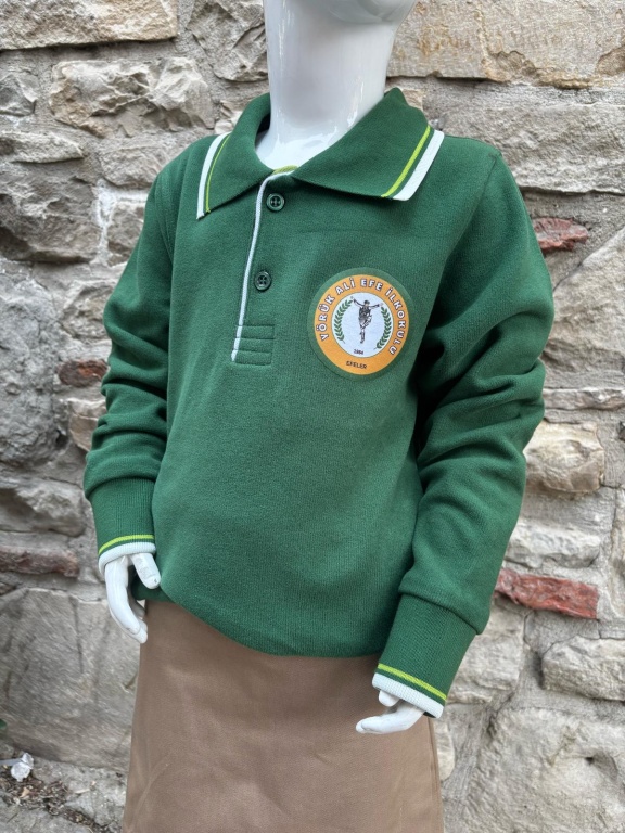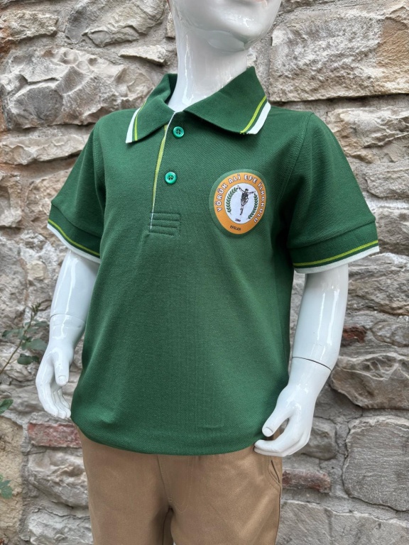 * İLKOKUL Öğrencileri için Doğal ve sağlıklı kumaşlardan (pamuklu), polo yaka, kısa veya uzun kollu yeşil renk tişört